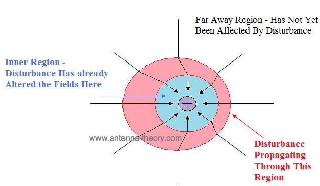 一旦充電速度增加,現(xiàn)場需要重新調(diào)整自己。請記住,這些字段只是因?yàn)樗鼈儧]有在圖1中充電而被包圍。但是,該字段只能響應(yīng)光速的事件。因此,如果一個點(diǎn)遠(yuǎn)離電荷,則擾動(或電場的變化)將需要一些時間來傳播。圖2說明了這一點(diǎn)。