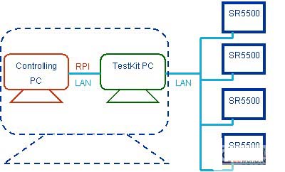 SR5500M提供了RPI接口(Remote Programming Interface)供外部程序控制SR5500M。如圖3所示,SR5500 Testkit軟件所在電腦通過TCP/IP與1臺(tái)至4臺(tái)SR5500M連接,控制電腦亦通過TCP/IP與SR5500M連接(通常, 可以用一個(gè)Switch連接所有設(shè)備);控制電腦和SR5500 Testkit軟件所在電腦合并為一臺(tái)電腦。